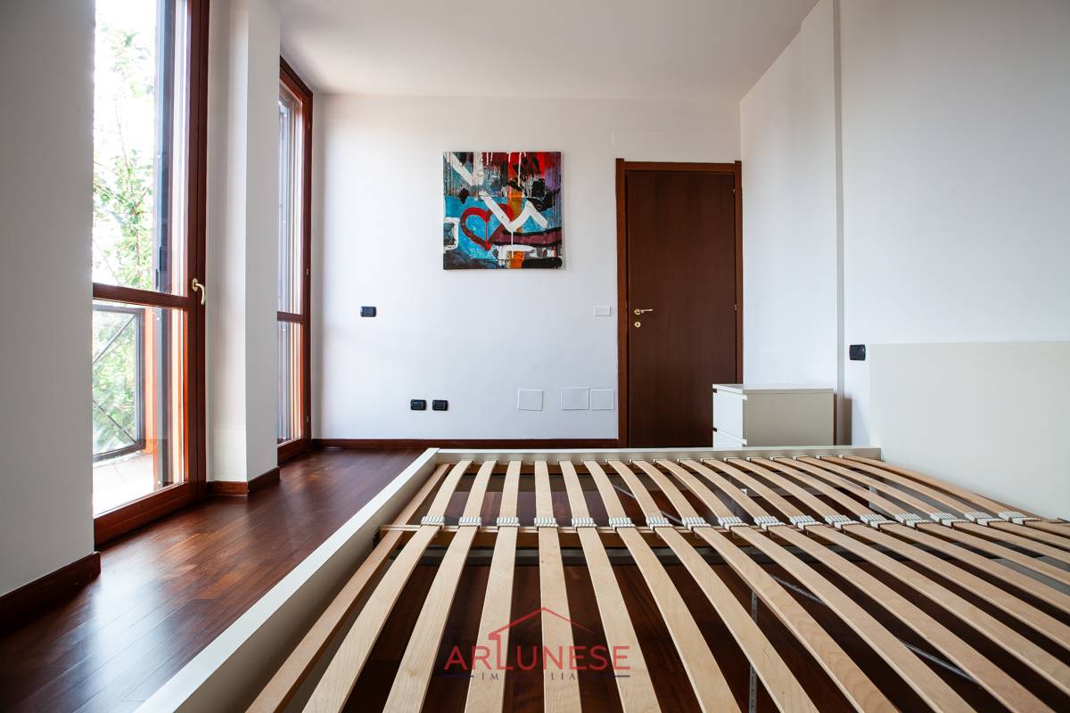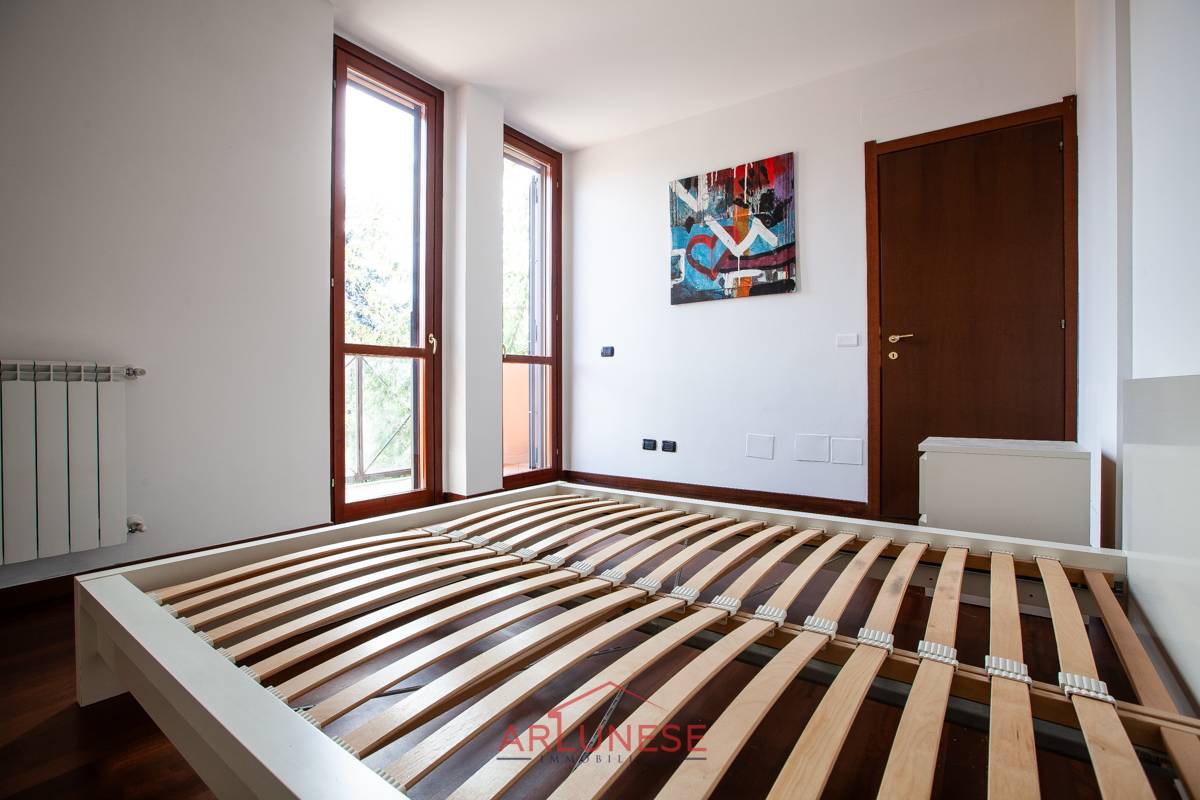 L'ampia camera da letto, dotata di una finestra con doppio vetro legno, grazie al balcone offre una piacevole vista sulla tranquilla zona circostante.